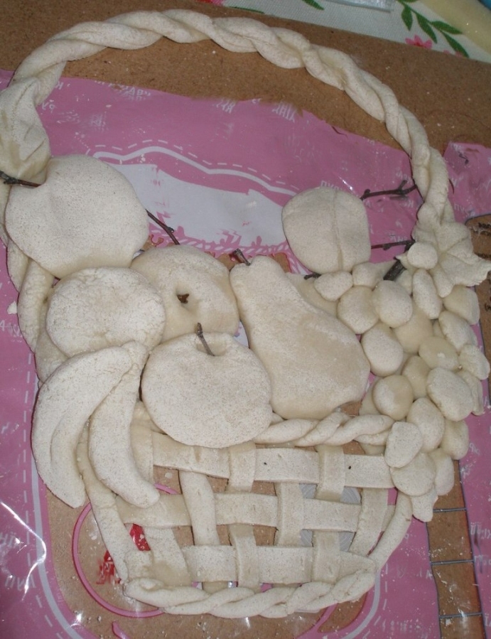 Теперь проявим фантазию и начнем творческий процесс. Раскатываем тесто, нарезаем полоски из соленого теста и плетем из них корзинку, как показано на фото. Затем наполняем корзинку различными фруктами. Потом необходимо, чтобы наше изделие полностью высохло. Когда изделие из соленого теста сухое, то постучав по нему ногтем, вы услышите звон.