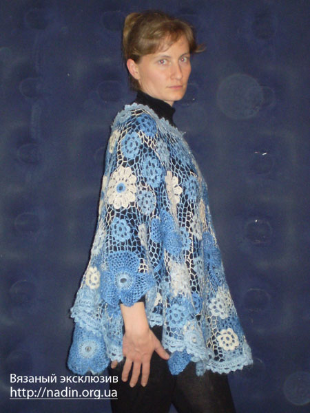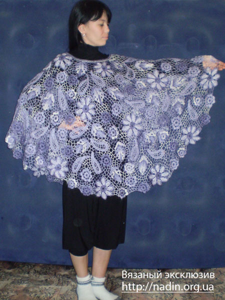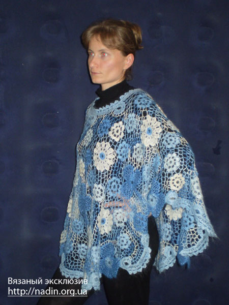 | Оригинальное пончо, выполненное крючком из отдельных мотивов в технике ирландского кружева. Модель эксклюзивна, поскольку изготовить два одинаковых пончо просто невозможно. Кроме того, вы можете заказать его в любой цветовой гамме. Чудесный подарок ручной работы из натурального пуха ангорской козы. | |